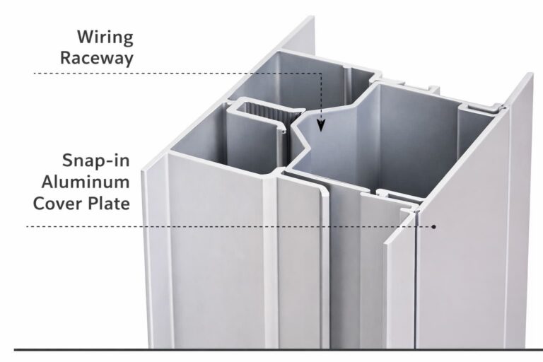 Wiring posts, made of painted steel or aluminum, double as supports and wiring chases, with snap-on covers for easy electrical access during maintenance or upgrades.
